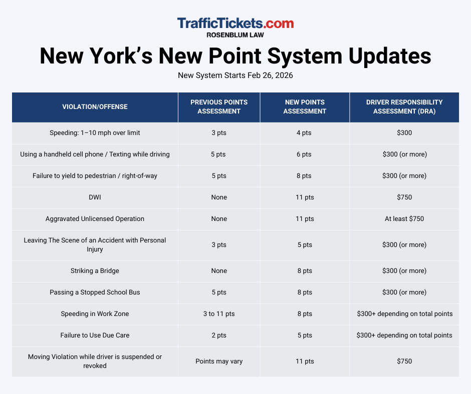 These new point system rules will impact many New York drivers, particularly those with serious offenses like driving while suspended, DWI or speeding in construction zones. The automatic 8-point penalty for construction zone speeding creates significant risks for drivers, even for minor infractions, while the extended look-back period could catch drivers off guard.